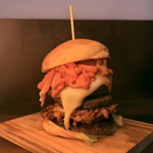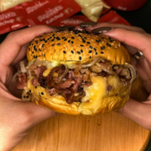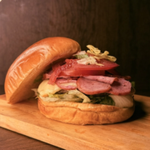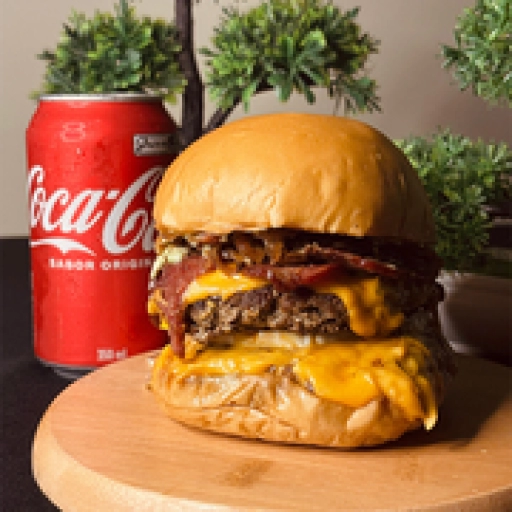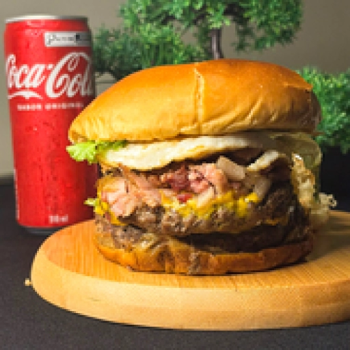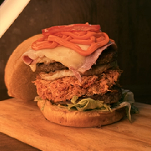 Pão de batata, carne artesanal 120g, queijo prato, calabresa picada e grelhada, bacon crocante, cebola caramelizada, mo... Ver completo